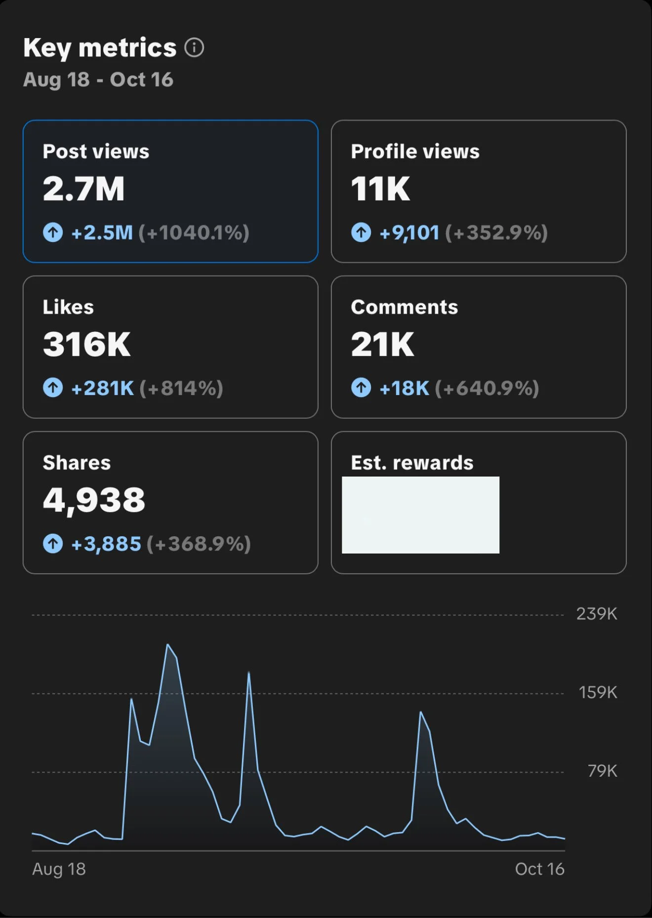 This is the first TikTok account I built completely from scratch as a test. In just a few months, I grew it to over 1.5 million views on a single video and reached hundreds of thousands more across multiple posts. I understand how to work with the algorithm and I can use that same strategy to grow your brand on TikTok, Instagram, and Facebook.